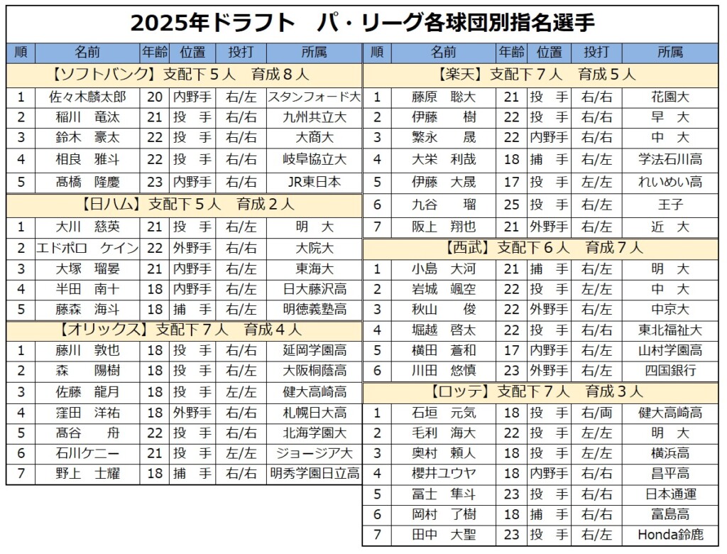 「オリックスは球団のビジョンをしっかりと示した。7人中、高校生が5人。しかも大型投手が4人。石垣はクジで外したが、完成度が高く、力強さにも欠けることのない延岡学園の藤川敦也を外れ1位で指名し、2位が大阪桐蔭の森陽樹で3位が健大高崎の左腕の佐藤龍月。山下舜平大や山﨑颯一郎ら大型の高卒投手を育成してきた球団のビジョンに沿ったいいドラフトになったと思う」