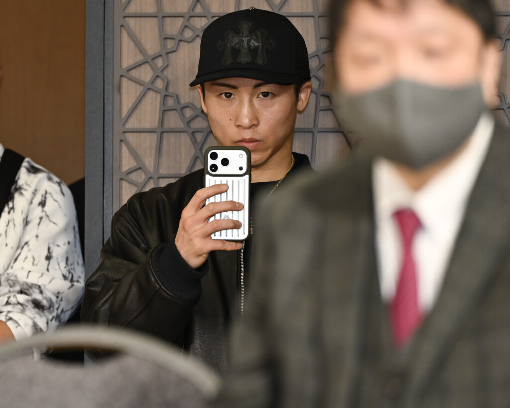 公式会見に続き計量会場にも兄の尚弥が来た。今回はチーム拓真の一人として壇上に上がり、スマホで計量シーンを撮影しながら見守っていた。