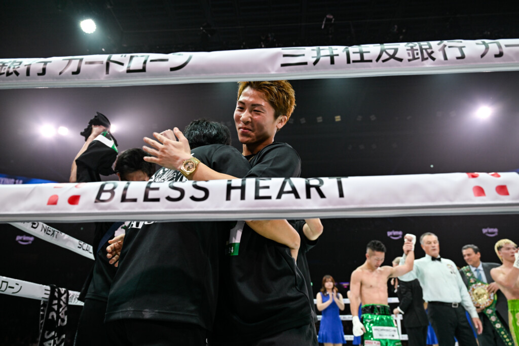 判定結果を聞くまでもなく勝利の確信があった。真吾トレーナー、そして兄の尚弥と抱き合い、一方の天心は、両手でコーナーのロープを持ち下を向きうなだれた。